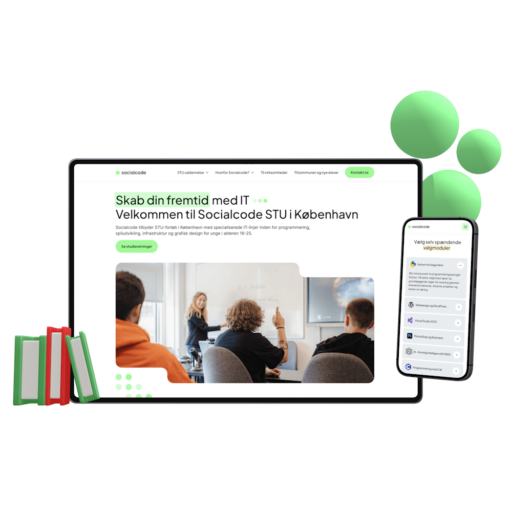 Socialcode tilbyder STU-forløb i København inden for IT med fokus på socialpædagogisk udviklingsarbejde kombineret med undervisning i moderne teknologier. Det var derfor altafgørende for Socialcode, at deres hjemmeside udstråler professionalisme, samtidig med at være brugervenlig og give et klart og tydeligt overblik over de kurser, de tilbyder.